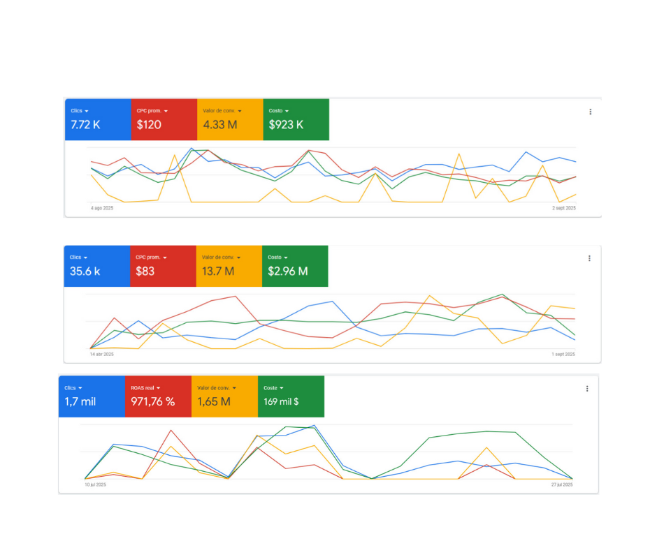 Utilizamos métricas clave como CPL (Costo por Lead), CPA (Costo por Adquisición), ROAS (Retorno sobre Inversión Publicitaria) y tasa de conversión. Reportamos semanalmente en Google Data Studio para que visualices impresiones, clics y conversiones en tiempo real.